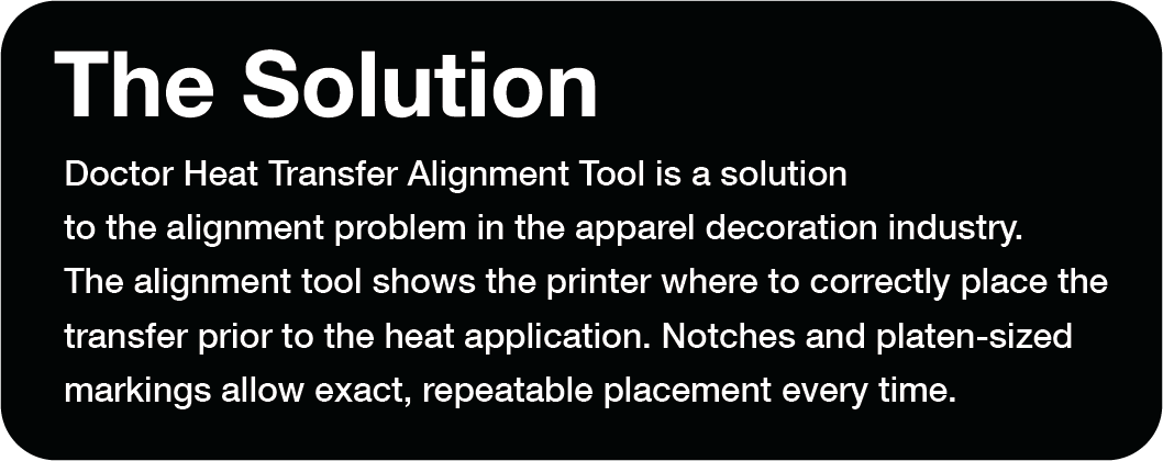 Doctor Heat Transfer Alignment Tool — engineered to remove guesswork from apparel decoration. Fast placement, consistent prints, and reduced error rates.